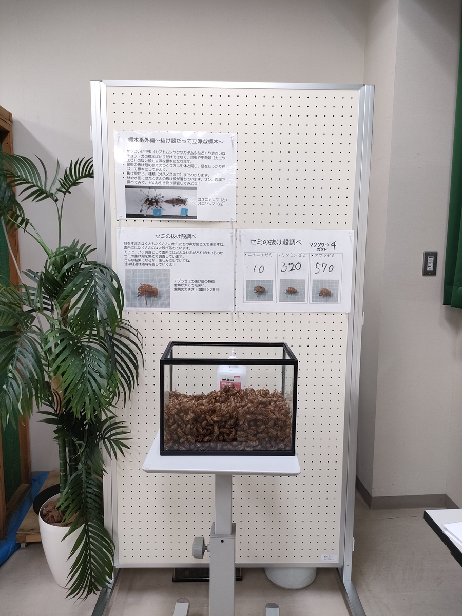 今年もいろんな生き物たちを展示しておりました。そして、番外編として、園内で回収のすることのできた「セミのぬけがら」を展示していたのを目にした方はいらっしゃいますでしょうか?同僚の方々には、おぞましい光景、という誉め言葉?をいただいていた展示です。